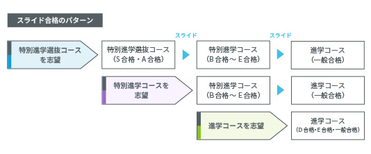 選択受験した志望のコースの入試結果が、合格ラインに達しなかった場合でも、他のコースにスライド合格できる制度がありますので、安心して受験できます。