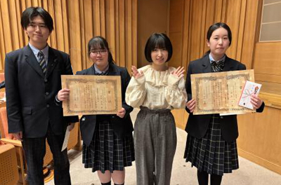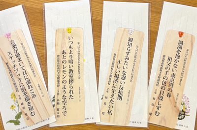 3月2日(日)みなかみ町カルチャーセンターで行われた第8回若山牧水みなかみ紀行短歌大会の表彰式に、本校文芸部が参加しました。今大会の賞状は薄くスライスした木を織り合わせた、木のほぐし織りの賞状となっています。入賞者への記念品である栞もほぐし織りで作られていました。
