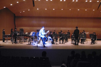 第2部は、テレビCMや声優などで活躍されている吉田孝さんを迎えて、吹奏楽部の演奏をバックに「かたあしだちょうのエルフ」を朗読していただきました。
