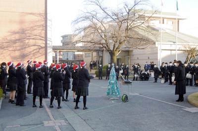 12月20日(月)、本校前庭の野外で音楽部がクリスマスコンサートを開催しました。クリスマスソングを中心に今までの練習の成果を披露し、下校途中の生徒が足をとめ演奏を聴いていました。
