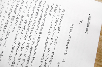 税に関する高校生の作文は、高校生が自身の経験などを通し税について考えたことを作文形式で発表することで税に対する関心を一層高めてもらいたいという趣旨で、国税庁が昭和37年度から毎年実施しています。