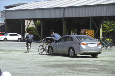 プロのスタントマンによる交通事故の再現が目の前で実演され、交通ルールを守らなかった場合の危険が迫力をもって実感できます。