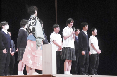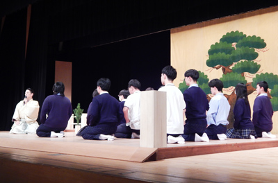 後半には代表生徒が和泉元彌さんから、狂言指導を体験させてもらいました。発声や立ち居振る舞いなど、慣れない所作に戸惑いも見られましたが、歴史に裏打ちされた伝統芸能の世界を堪能できました。