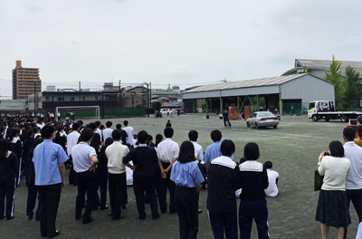 7月5日(水)1,2時間目に交通安全教室を実施しました。今年度の交通安全教室では、プロのスタントマンによる交通事故の再現が行われました。交通ルールを守らなかった場合の危険が迫力をもって繰り広げられ、普段の自身を改めて思い直す時間になりました。また何名か生徒が代表として実験に参加し、ヘッドホン装着時の自動車接近への気づきにくさや大型車両の内輪差などを実際に体験しました。(安全に充分配慮して実施しております。)